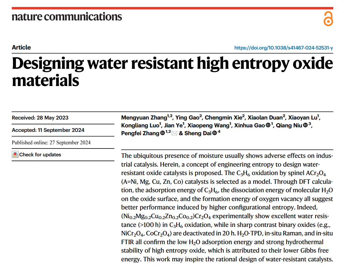 张鹏飞课题组在高熵氧化物抗水机制研究方面取得进展。该工作以“Designing water resistant high entropy oxide materials”为题发表在国际重要期刊《Nature Communications》。该论文第一作者为博士生张梦媛,张鹏飞教授为唯一通讯作者,宁夏大学为第一完成单位。